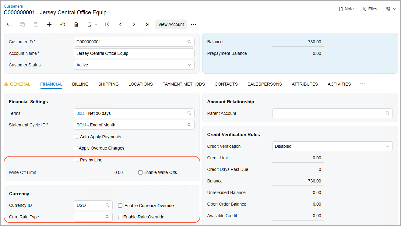 On Customers (AR303000) form, review the layout of the Financial tab and make sure that the following criteria are met