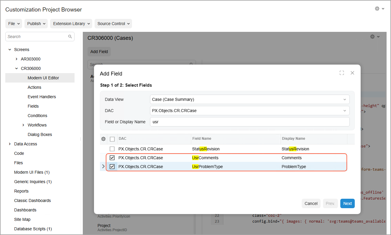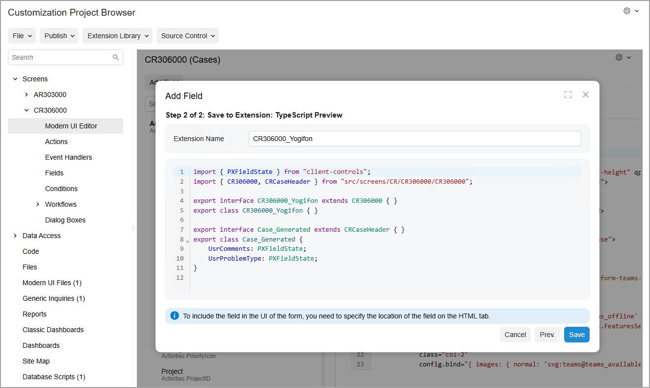 To add new fields, do the following in the Customization Project Editor: