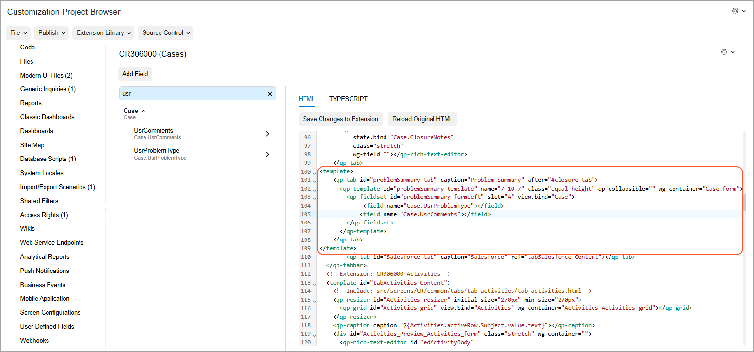 Suppose that you want to add the new Problem Type and Comments boxes to the Cases (CR306000) form. Further suppose that you want to arrange these boxes on a separate Problem Summary tab (which should be placed after the Closure Notes tab). By using the added tab and boxes, the employees will be able to specify and view information related to the closure of the case (such as the type of the problem and customer's comments).