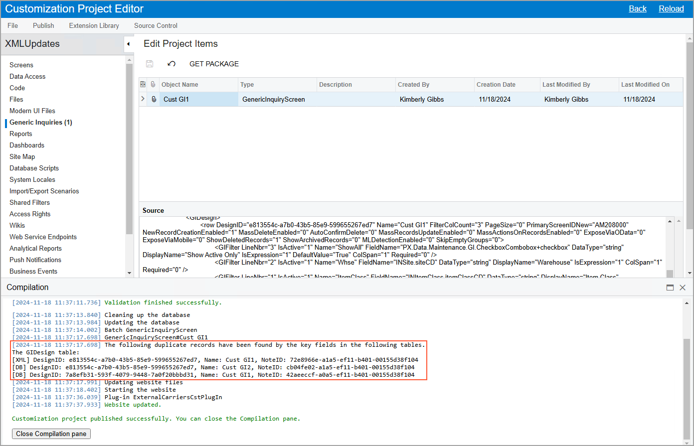 The system checks for duplicate records during the publication of customization projects. Suppose that an item in a customization project has the same key (the primary key, the unique index, or the unique key) as the records that exist in the system. When you publish such a project, the system displays a warning and overwrites the existing records with the item from the project (see the following screenshot).