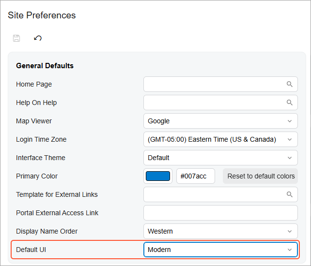 To specify the user interface for all forms, use the Default UI setting on the Site Preferences (SM200505) form. It defines the UI to be used by default (Modern UI or Classic UI) for all users of the current tenant.