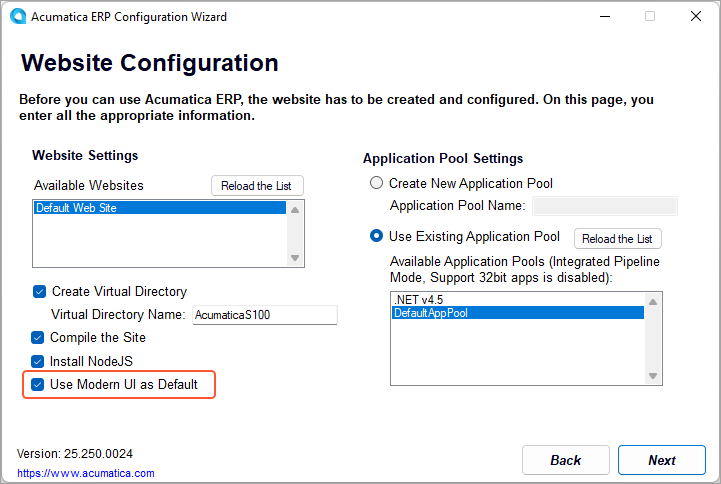 When you deploy a new instance of MYOB Acumatica or update and existing instance, the MYOB Acumatica ERP Configuration Wizard now suggests using the Modern UI by default, as seen below.