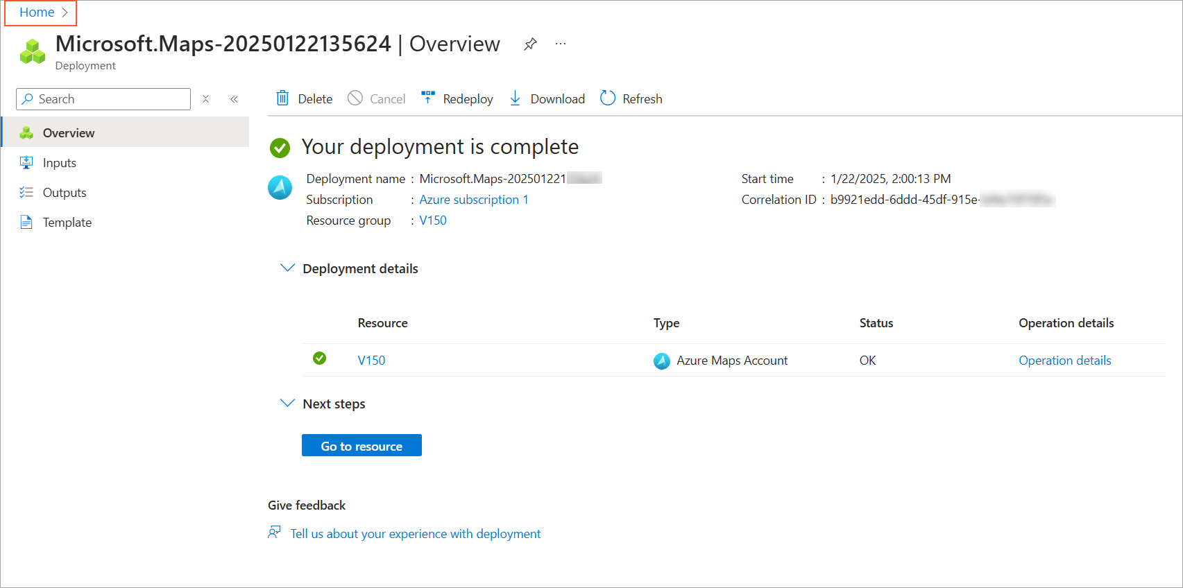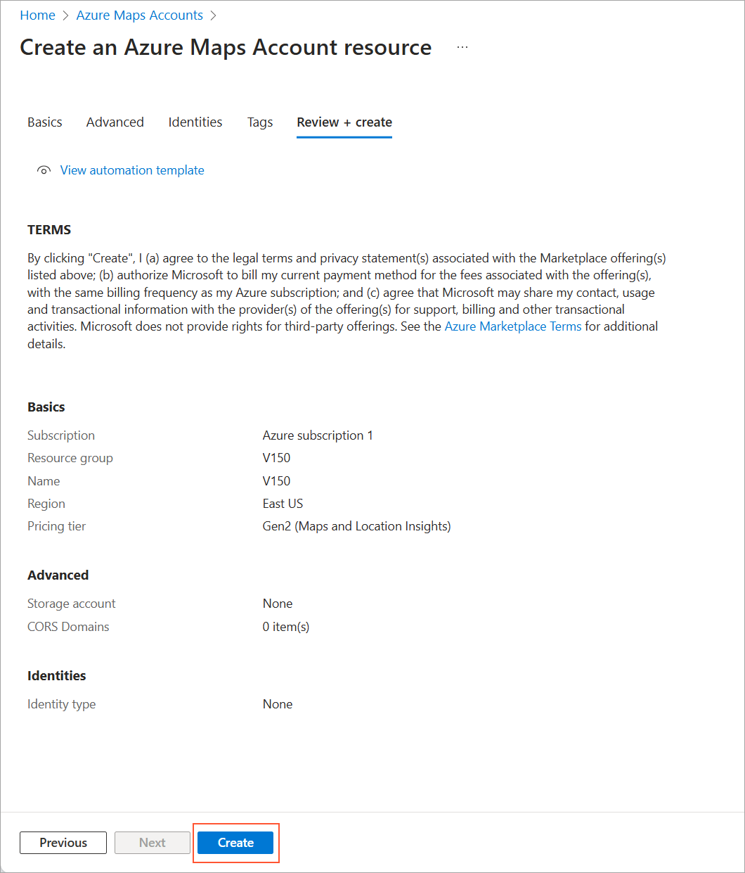 - On the Create an Azure Maps Account resource page, fill in all required fields. For Resource group, click Create new. At the bottom, click Review + create.