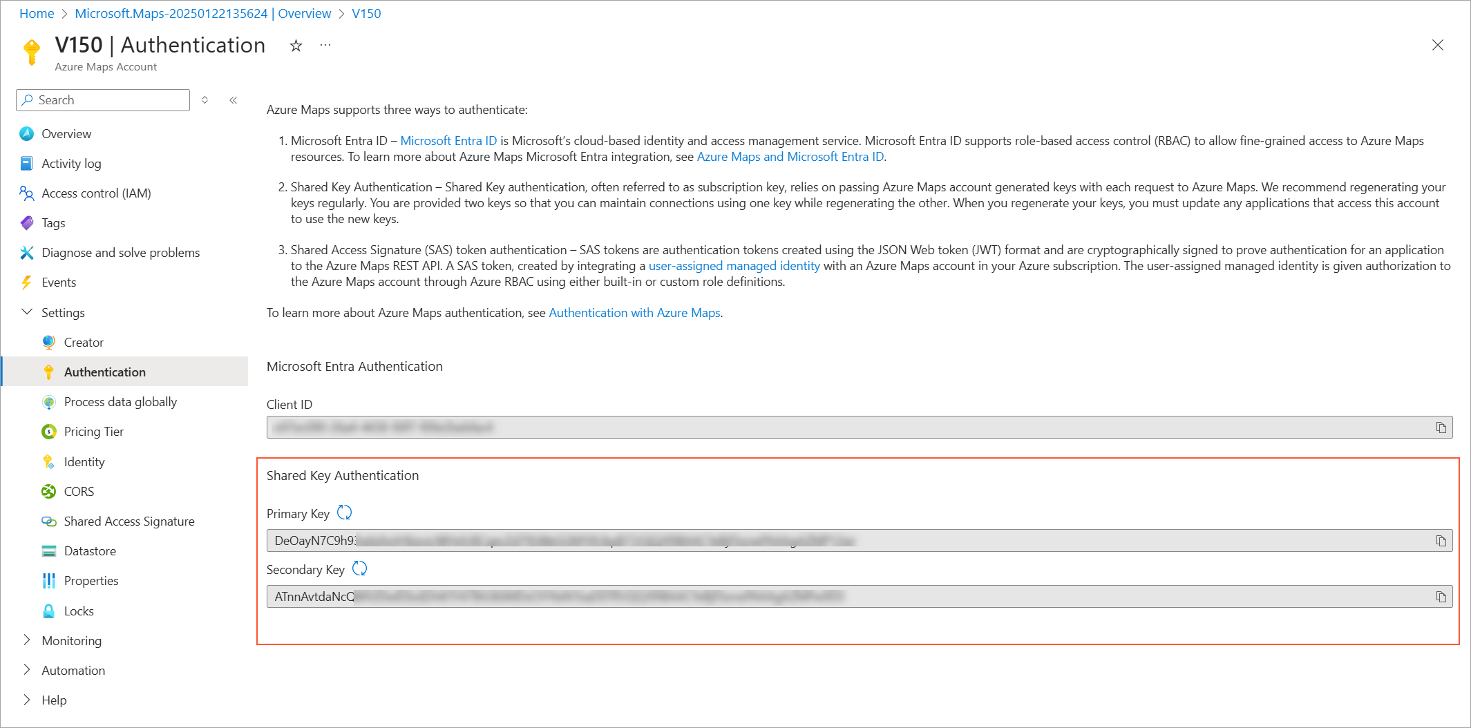 On the page that opens, find the generated keys in the Shared Key Authentication section (shown in the following screenshot).