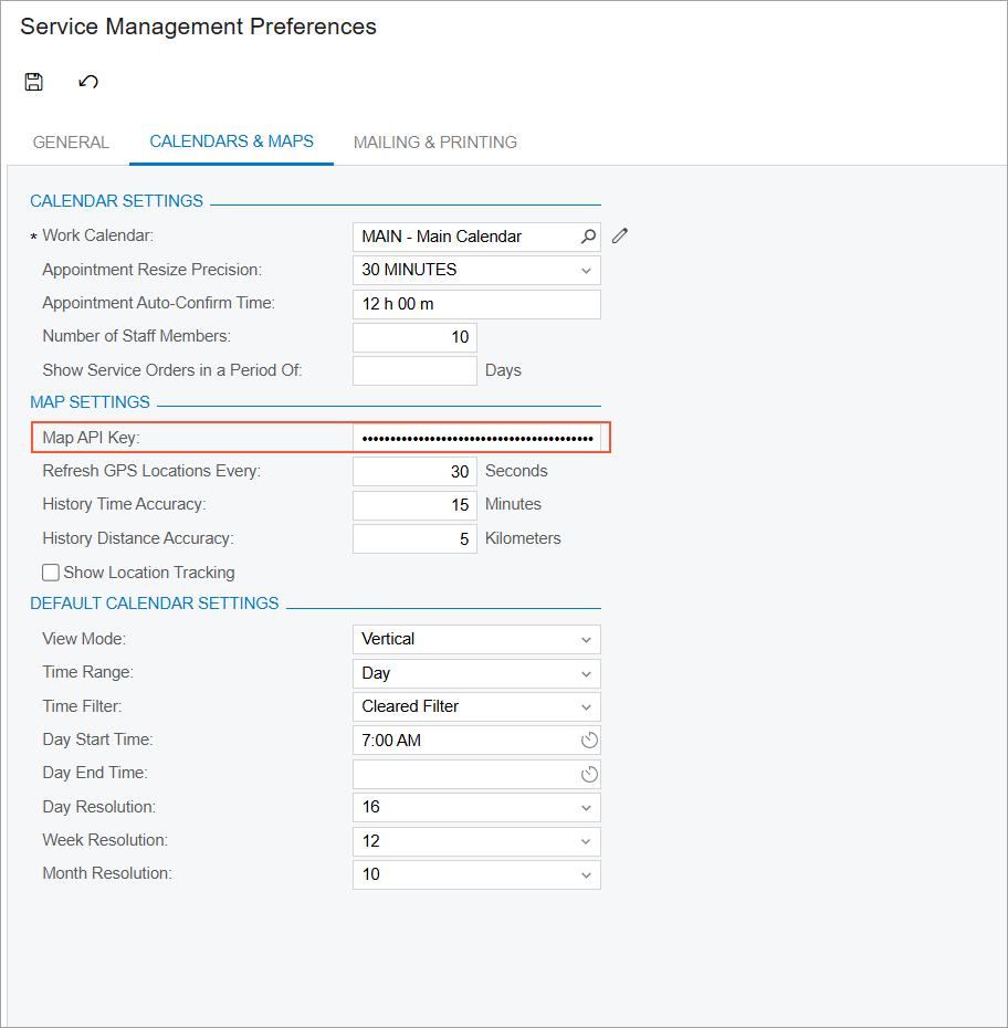 On the Enable/Disable Features (CS100000) form, you will enable the Route Management feature. Then, on the Route Management Preferences (FS100400) form, you will review the basic route management settings. Finally, you will generate a map key on the https://portal.azure.com website and specify this key on the Service Management Preferences (FS100100) form.