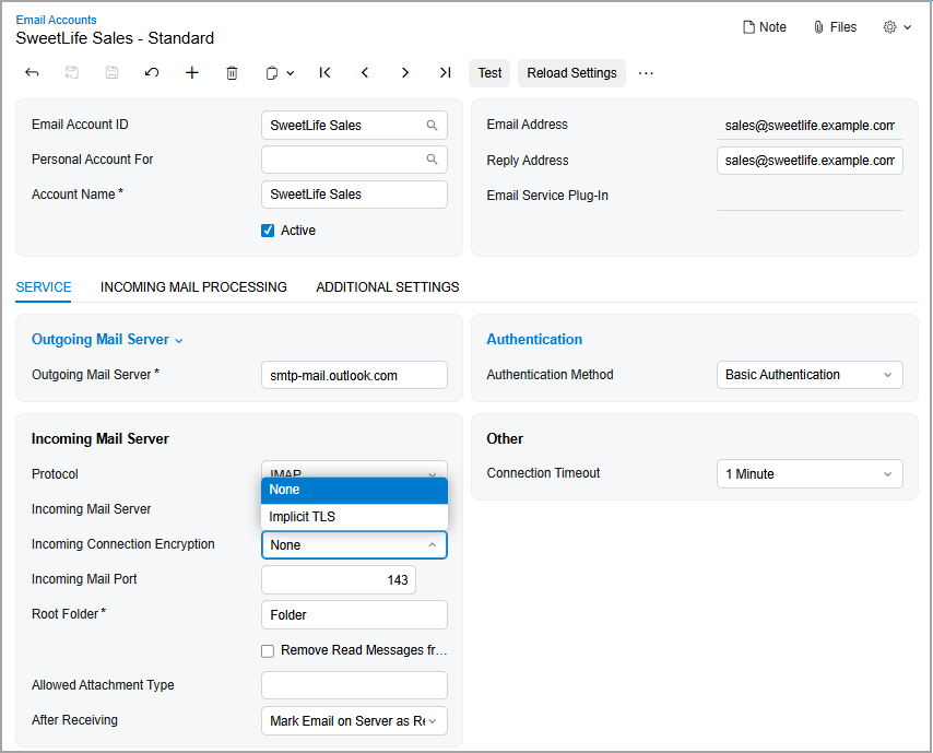 - Implicit TLS (default): Encryption is applied immediately when the connection is established. By default, the system uses the IMAP protocol with port 993. If you select the POP3 protocol, the system uses port 995.