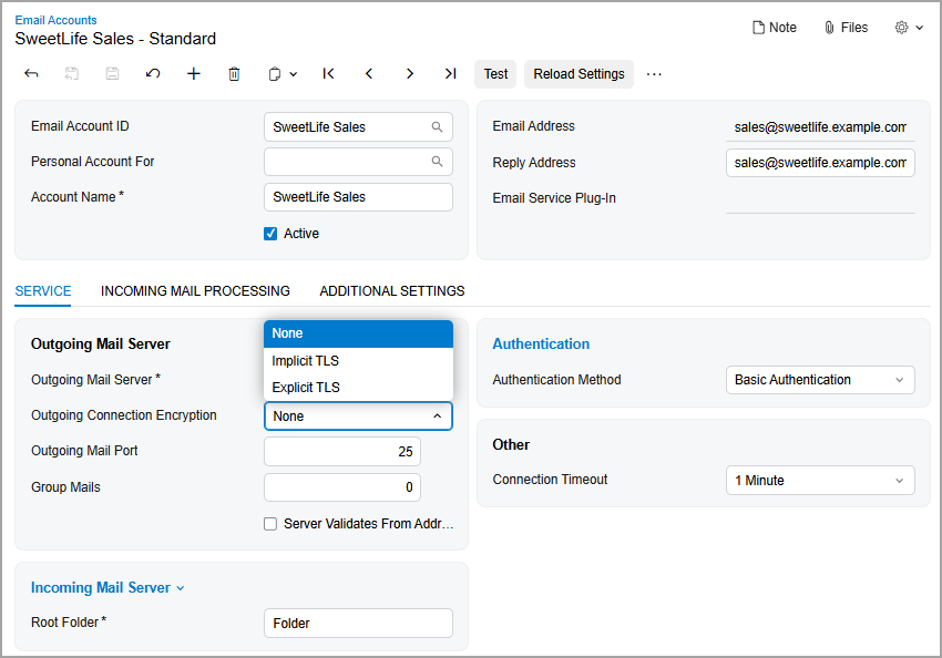 On the Email Accounts (SM204002) form, you can now flexibly manage how your system secures connections with mail servers.