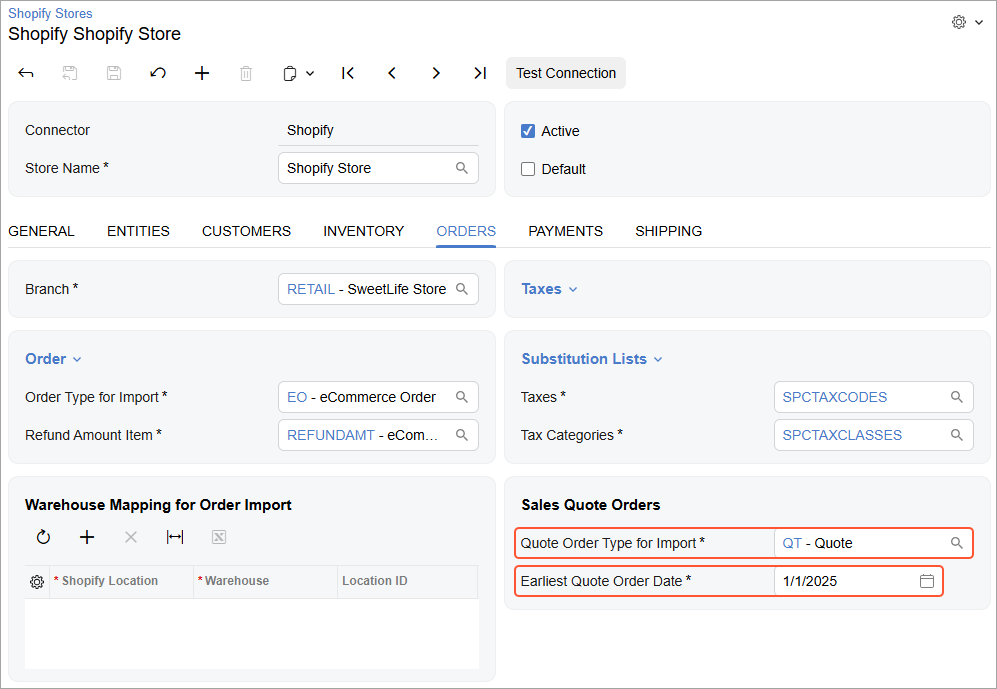 - Were created on or after the date specified in the Earliest Quote Order Date box on the Orders tab of the Shopify Stores (BC201010) form