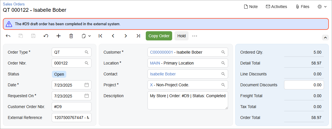 By default, the new sales order is assigned the type specified in the Order Types for Export box on the Orders tab of the Shopify Stores (BC201010) form. When you create a sales order, the sales quote is assigned the Completed status in MYOB Acumatica.