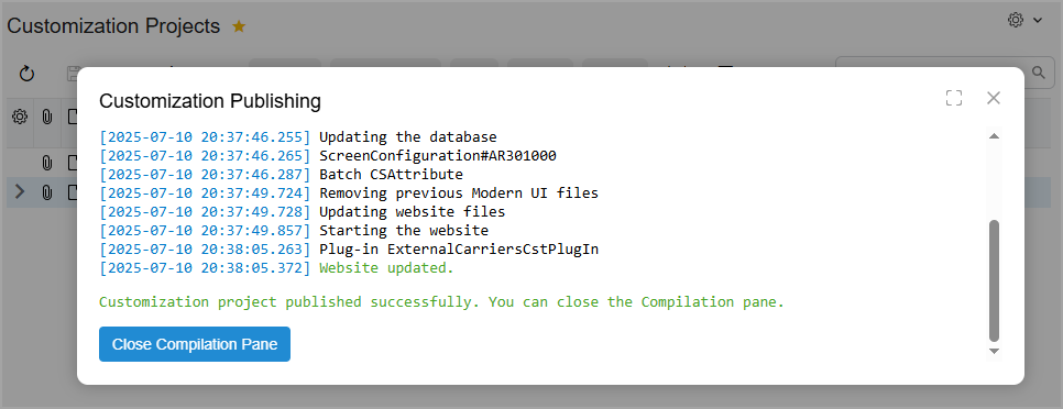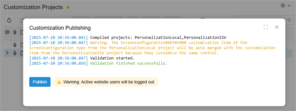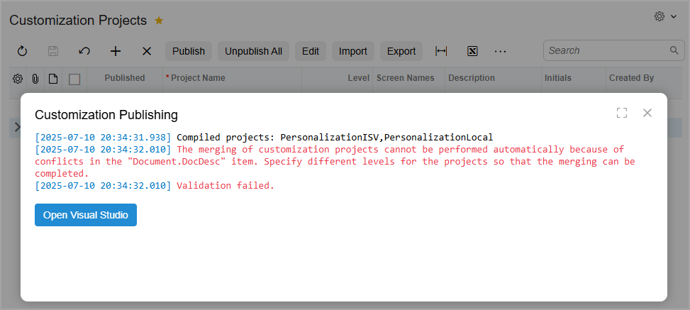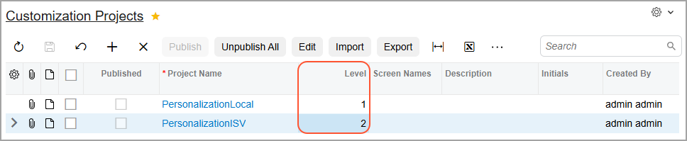 To do this, go back to the Customization Projects (SM204505) form, assign the highest level to the most important changes, as shown below, and start the publication again.