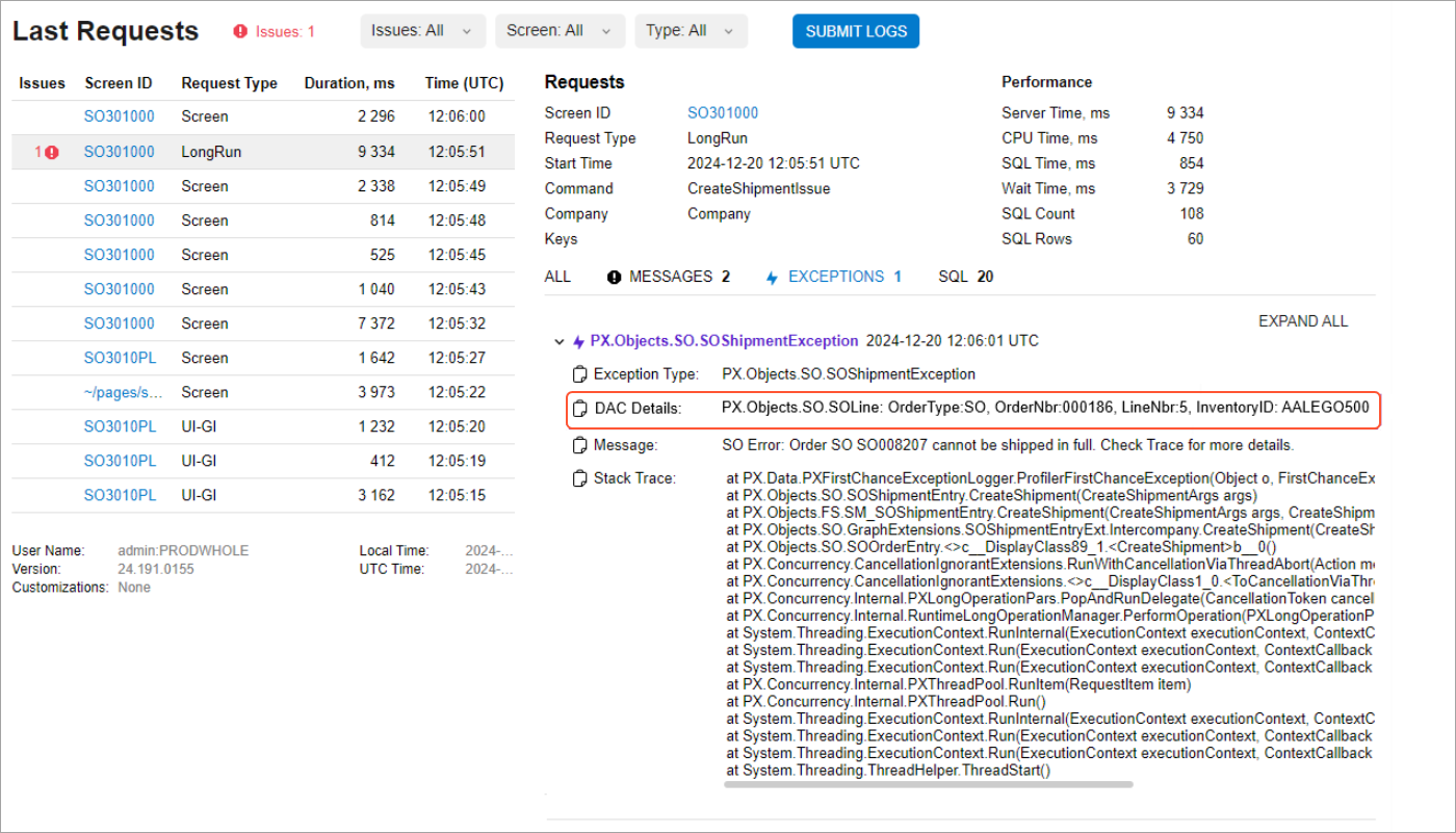 - You can view the descriptor information on the Acumatica Trace page in the new DAC Details section of the Exceptions tab.