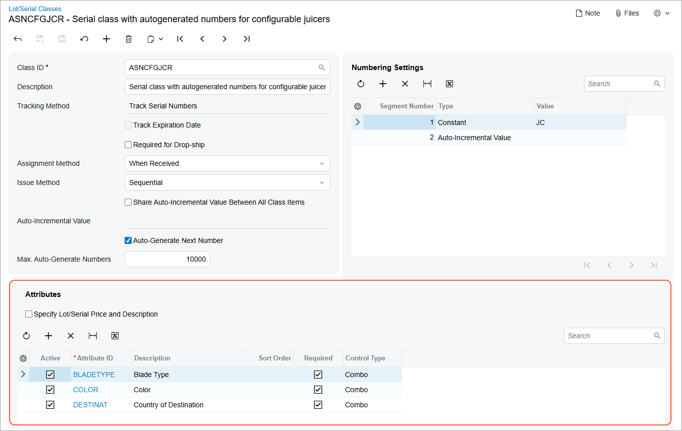 To start using attributes, first create them on the Attributes (CS205000) form—or verify that they already exist. Once that's done, add the attributes to a lot or serial class on the Lot/Serial Classes (IN207000) form. You can add or delete attributes in the Attributes section (see below) if the class has the following settings: