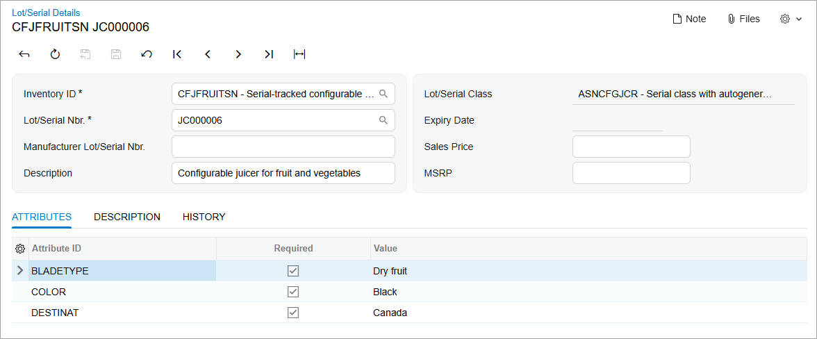 The Lot/Serial Details (IN209600) form gives you a complete view of the attributes for each unit of a stock item tracked by lot or serial number. You can access this form only from the Lot/Serial Details (IN2096PL) list of records.