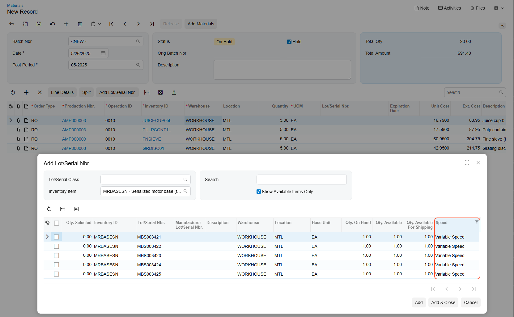 Now you can select specific stock item units with attributes when issuing materials to a production order on the Materials (AM300000) form.