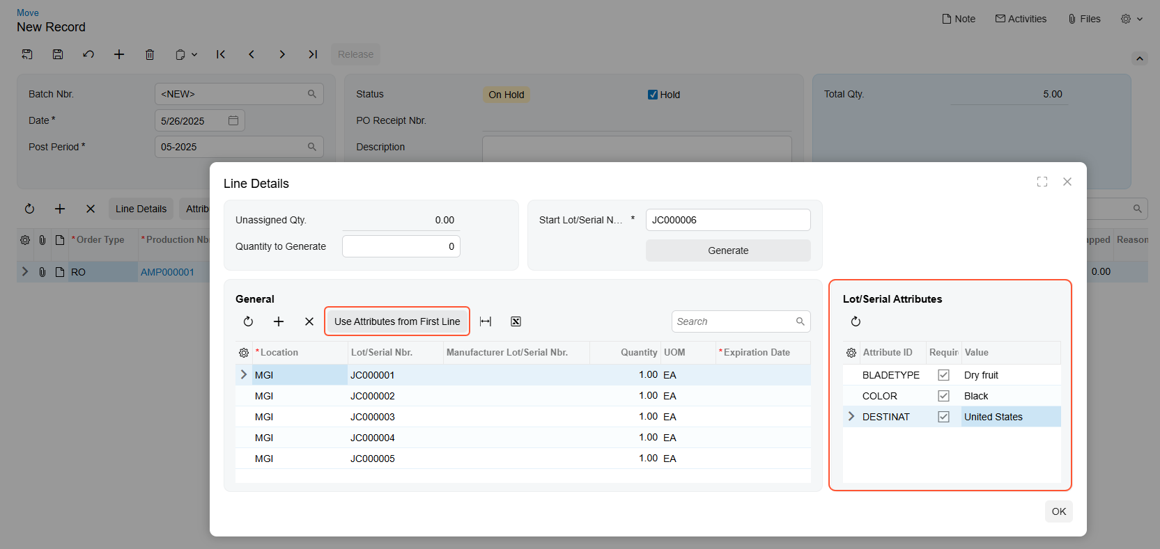 Now you can capture lot or serial attribute values as you receive units into stock from production. On the Move (AM302000) form, open the Line Details dialog box and fill the attribute values in the Lot/Serial Attributes table, which you can see below.
