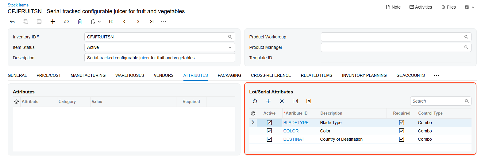Once you assign attributes to a lot or serial class, they're automatically added to the Lot/Serial Attributes table on the Attributes tab of the Stock Items (IN202500) form. Here you can easily review and manage the assigned attributes before using the item in production.