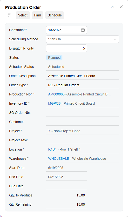 Take immediate action directly from the Production Schedule Board (AM215555) form—right-click any production order and select the needed command to schedule, reschedule, or firm the order. You can also click View to open the Production Order panel (shown below), where you can: