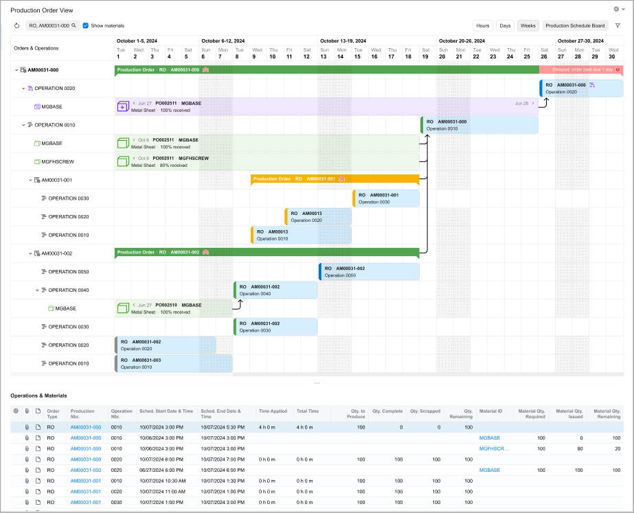 - Quickly spot delays and progress: Visual indicators show you whether production orders are late, early, or on time.