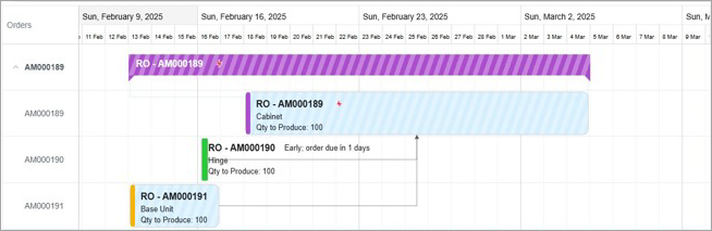 - See the full timeline at a glance: A single graphical bar represents a top-level production order and all its dependent subassemblies. Expand or collapse the view to show or hide child orders.