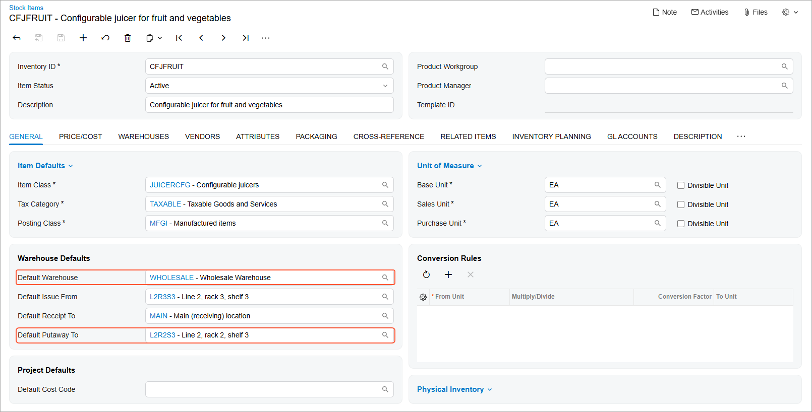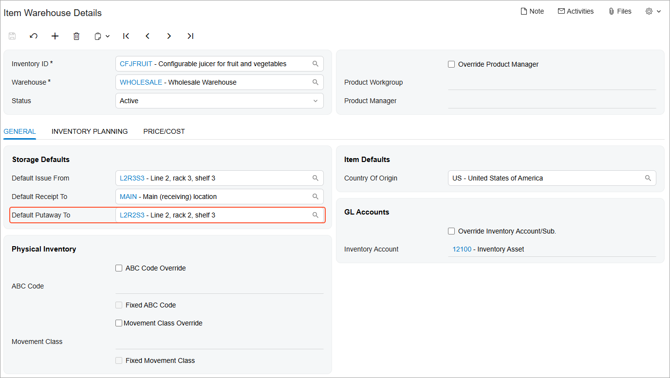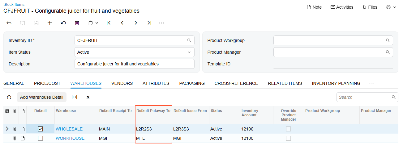 - You can now specify default putaway locations for a stock item on the Item Warehouse Details (IN204500) and Stock Items (IN202500) forms.