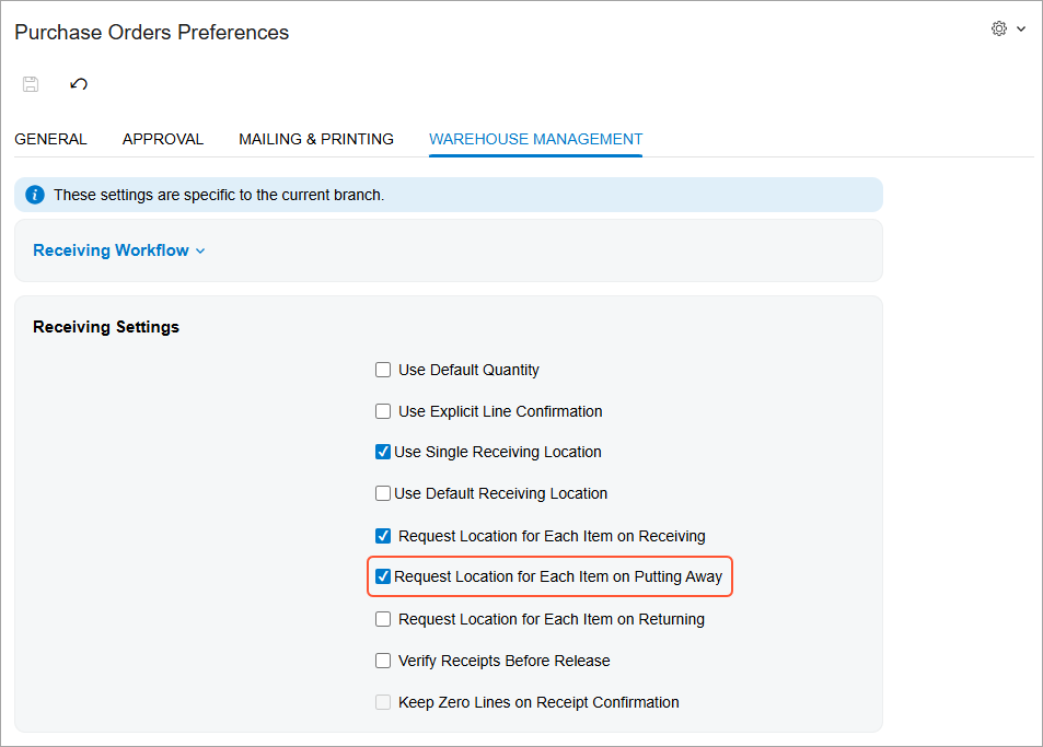 - Directed putaway works if you select the Request Location for Each Item on Putting Away check box on the Purchase Orders Preferences (PO101000) form.
