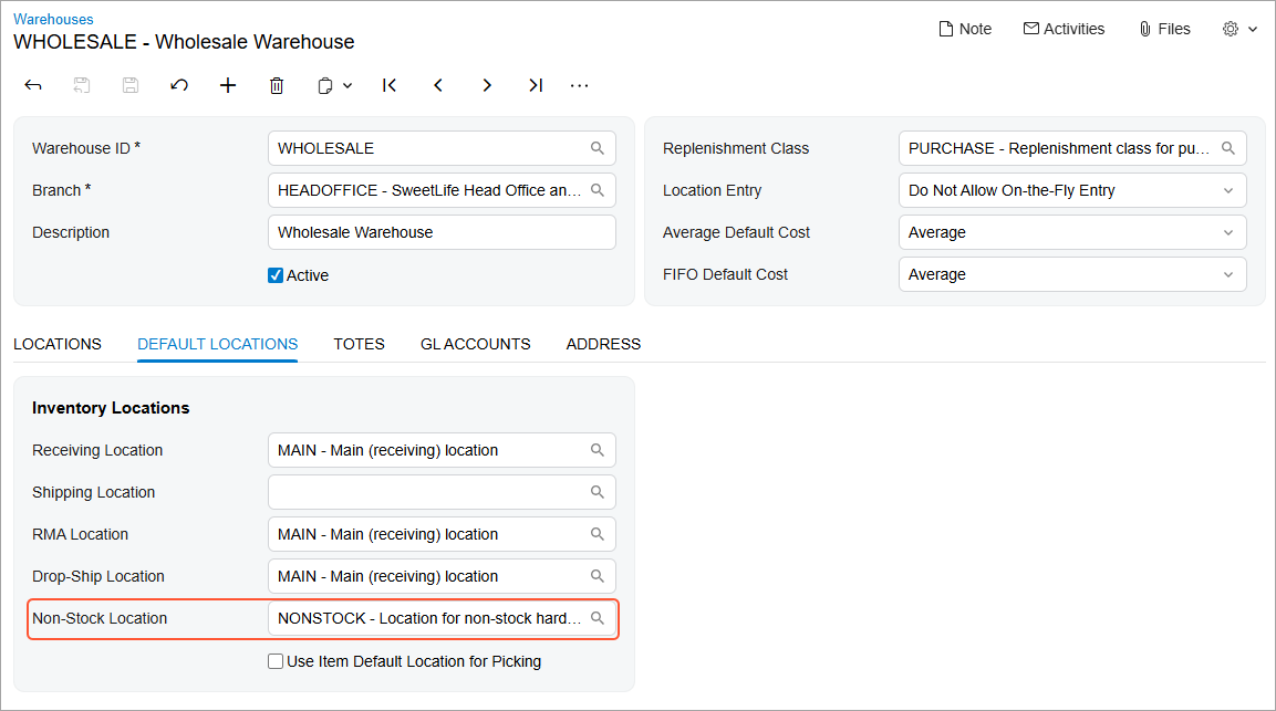 Specifying the Default Putaway Location for Non-Stock Items