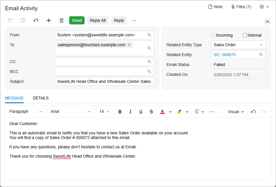 In MYOB Acumatica 2025.2.1, you can now preview emails generated by business events before they’re sent and modify their content. You can review and edit the content of the emails, add or remove the attached files, manage recipients and so on.