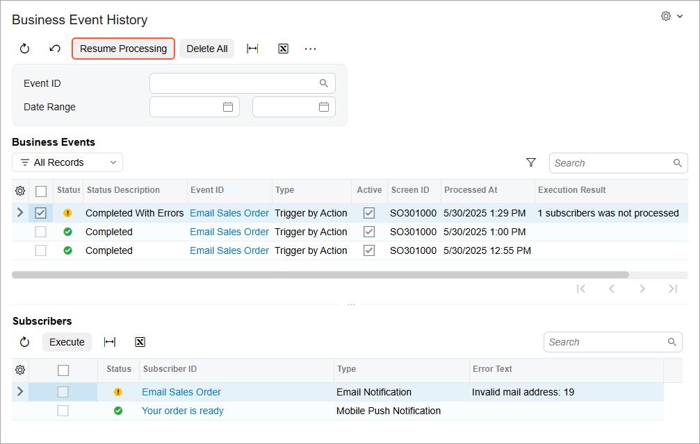 Starting in MYOB Acumatica 2025.2.1, you can resume the processing of business events that completed with errors. By clicking the Resume Processing button on the Business Event History (SM502030) form, as shown below, you reprocess business events with the Failed and Completed With Error statuses.