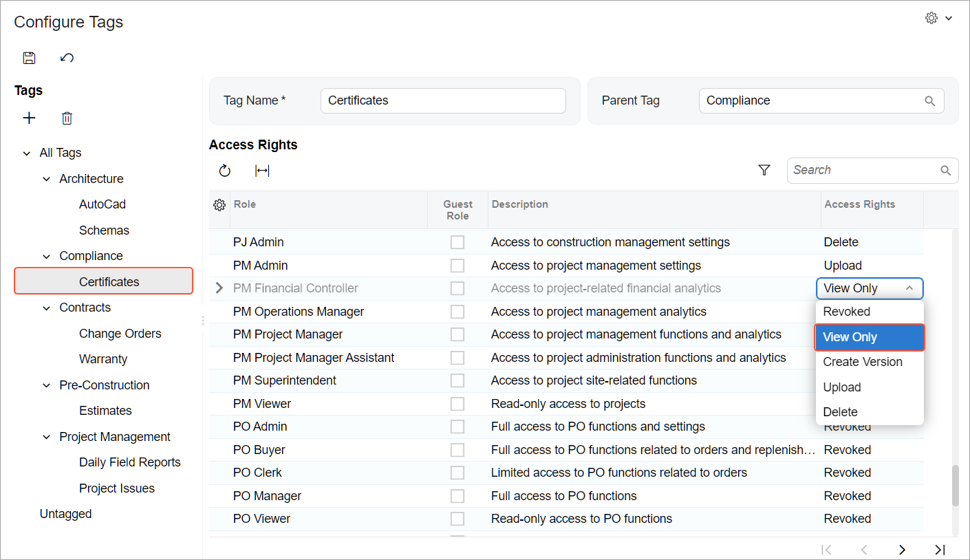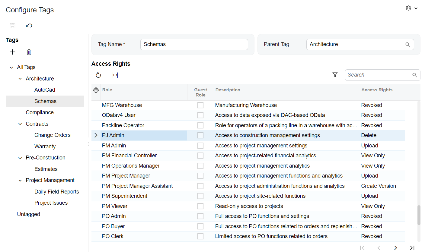 For each role an employee might have while working with projects, select the needed access level in the Access Rights column (see below). The default access level, Revoked, is assigned to the remaining user roles, indicating that users with these roles won’t have access to files with this tag.