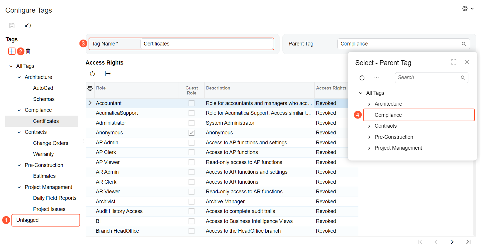 Then create tags under the All Tags node. You can create tags within tags for better visibility and easier maintenance—but note that access rights aren’t actually inherited. Add a new tag by clicking Add in the Tags pane (Item 2) and entering the tag's name (Item 3). To nest the tag under another tag, select that tag in the Parent Tag box (Item 4); otherwise, the tag will be under All Tags.