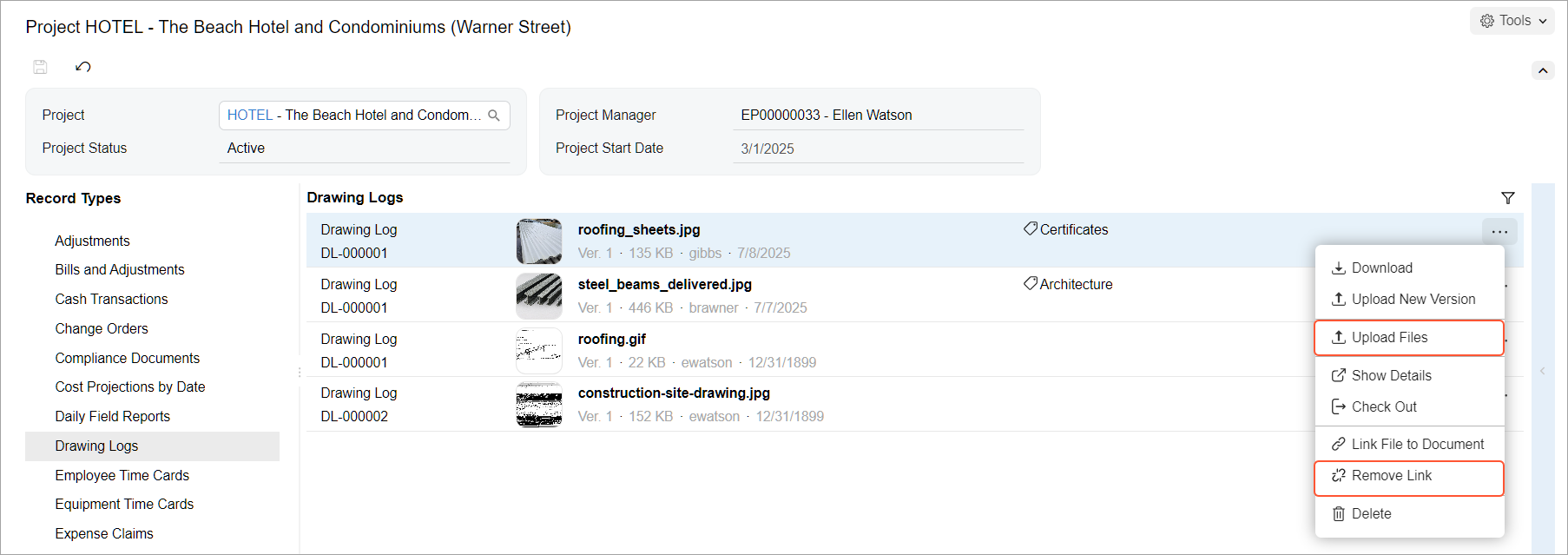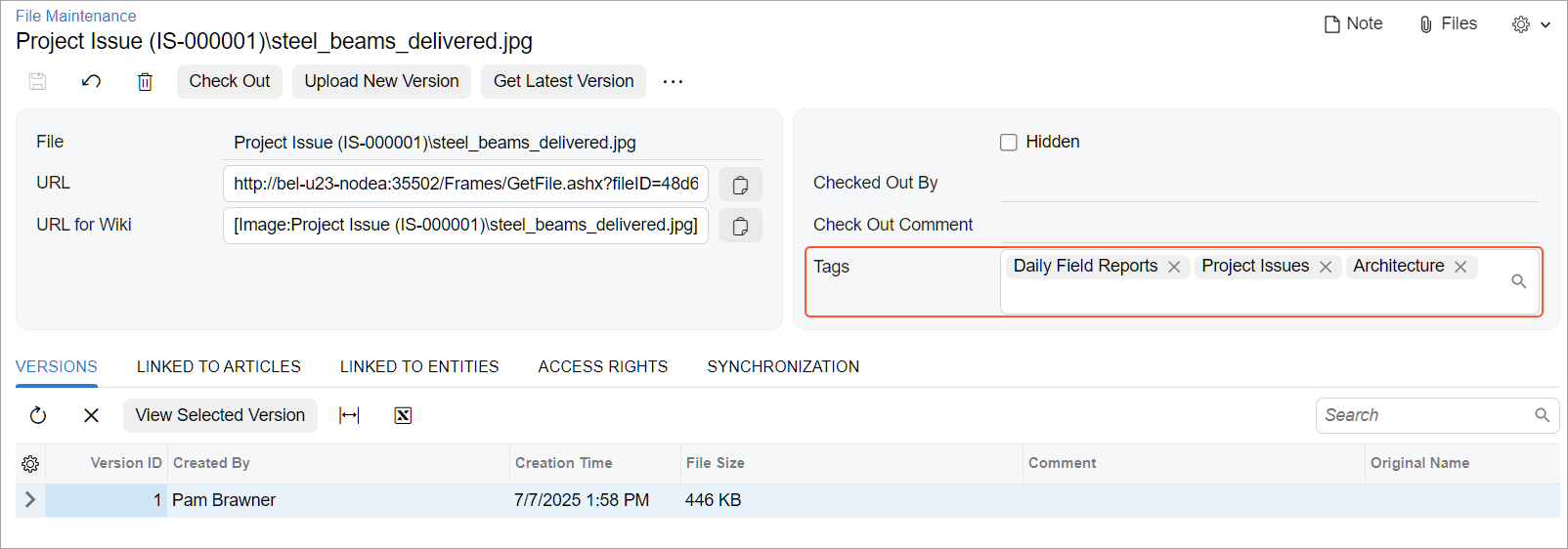 Also, you can add tags to files attached to the Drawing Log (PJ303000), Photo Log (PJ305000), and Photo (PJ305010) forms by using the Tags box on these forms.