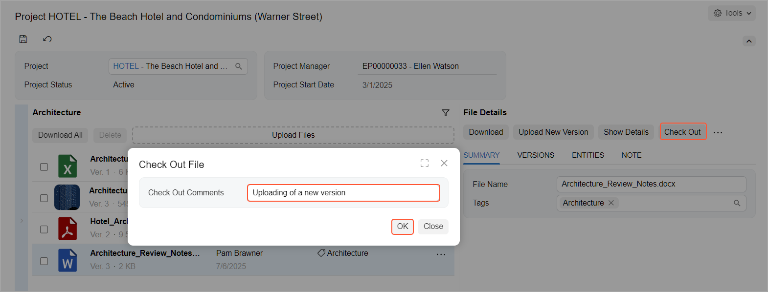 You check a file out to edit it and prevent others from making changes or deleting it. To do this, click Check Out on the Manage Project Files by Tag (PM509000) or Manage Project Files by Record Type (PM509500) form. In the Check Out File dialog box, enter a reason and then click OK.