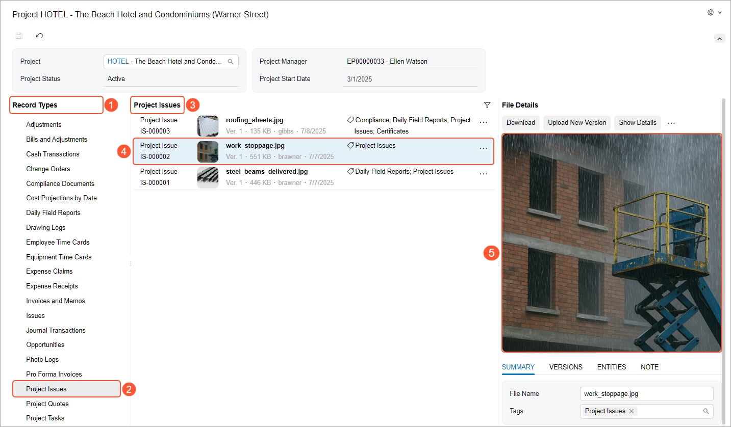 To start, select a project in the Project box; the system shows its status, manager, and start date. By default, the system selects the first record type in the Record Types pane (Item 1 below).