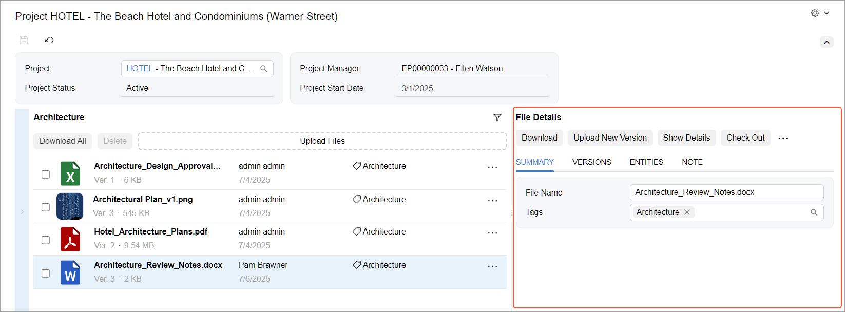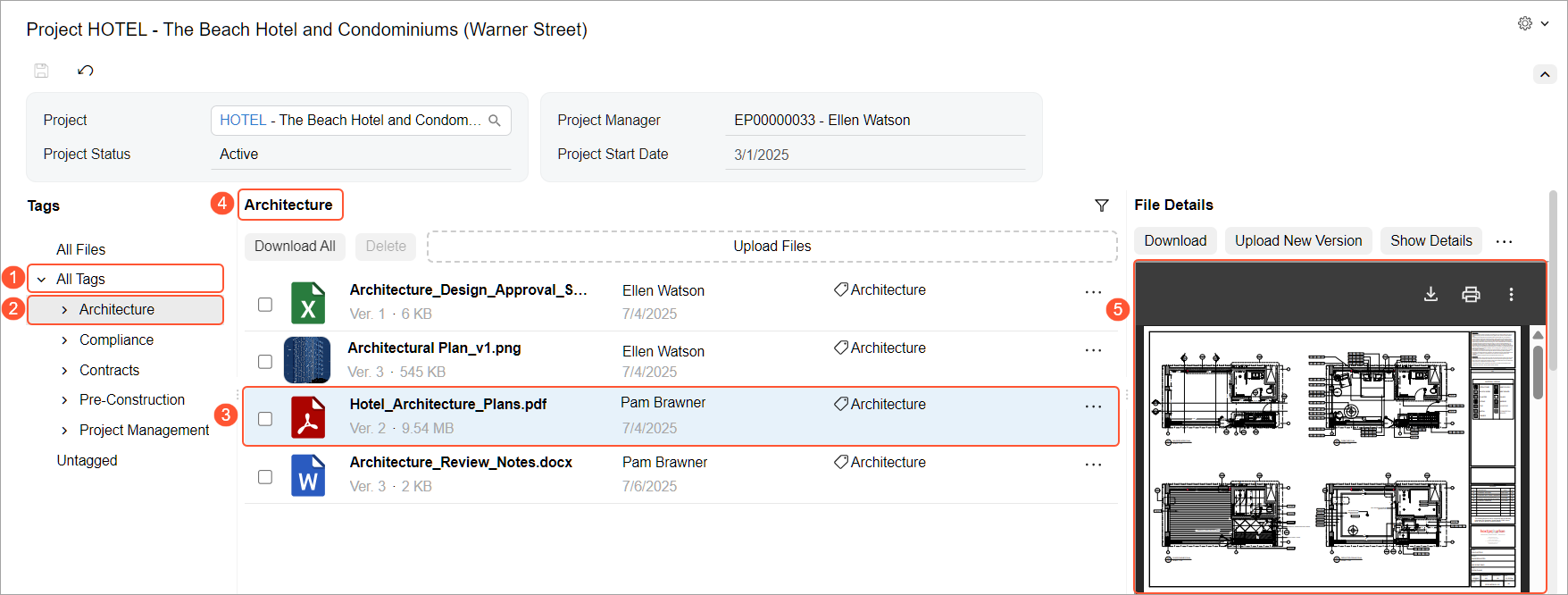To start, select the project in the Project box to view its status, manager, and start date. By default, the All Files node is selected (Item 1 below), and the central pane shows all the project’s files.
