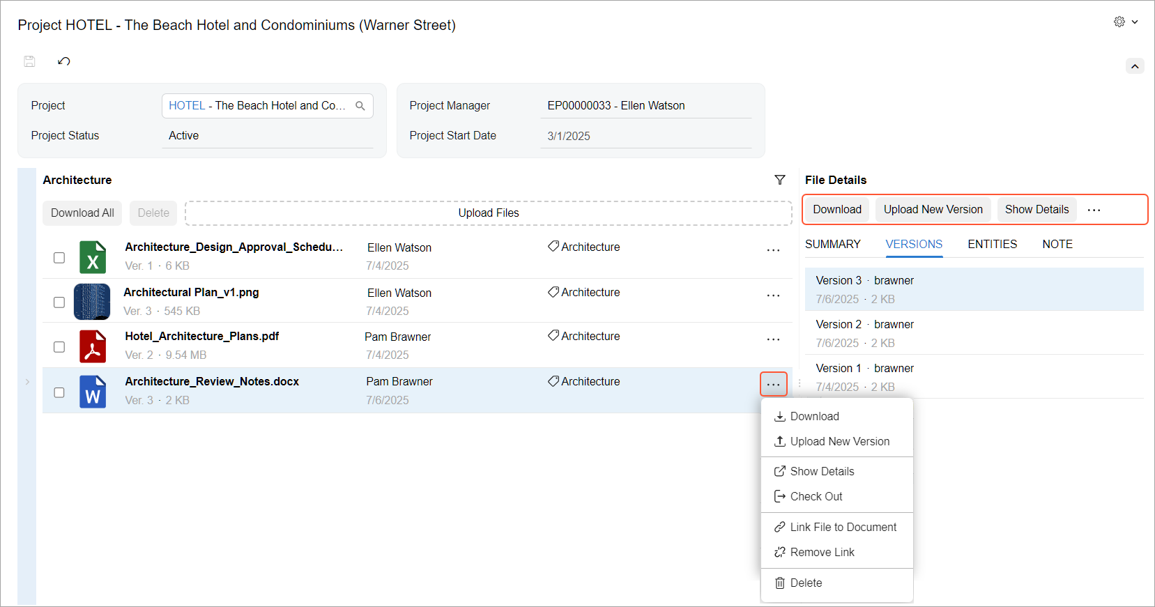 - Versions: Review the file’s version history, including its size, upload dates, and uploader.