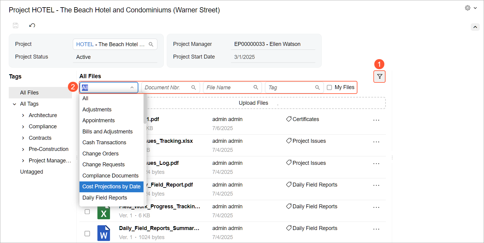 If you're looking for a specific file or set of files attached to a project-related record, it's easy to narrow the list or find the file you need. On the Manage Project Files by Tag (PM509000) form, click Filter (Item 1) to open the filtering area (Item 2). Here, you can narrow project-related records by their type, reference number, file name, or tag. To see only the files that you’ve uploaded, select My Files.
