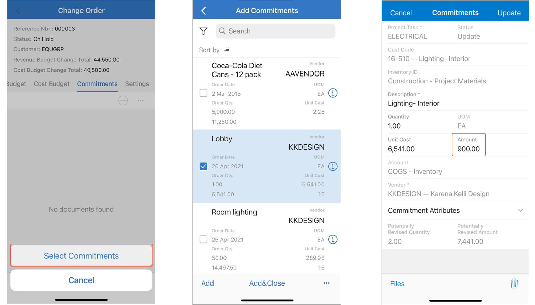 - Add existing commitments and change requests to a change order on the Change Order screen
