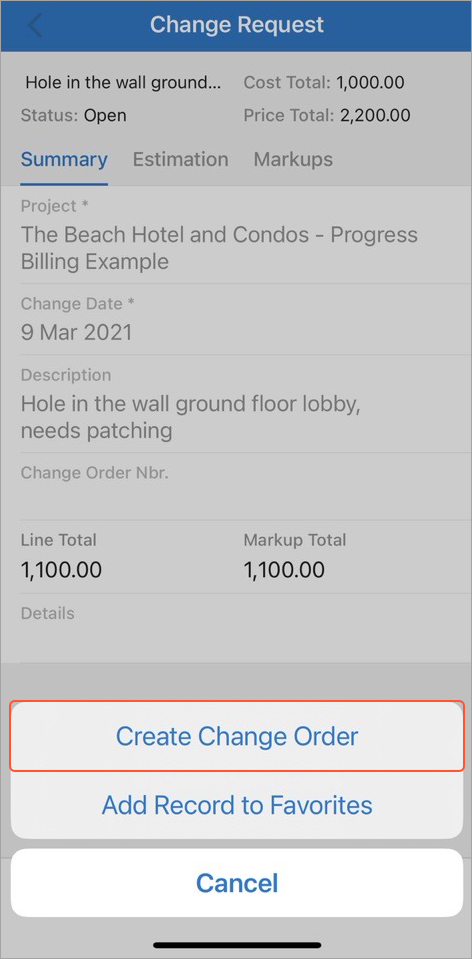 - Create a change order from the Change Request screen