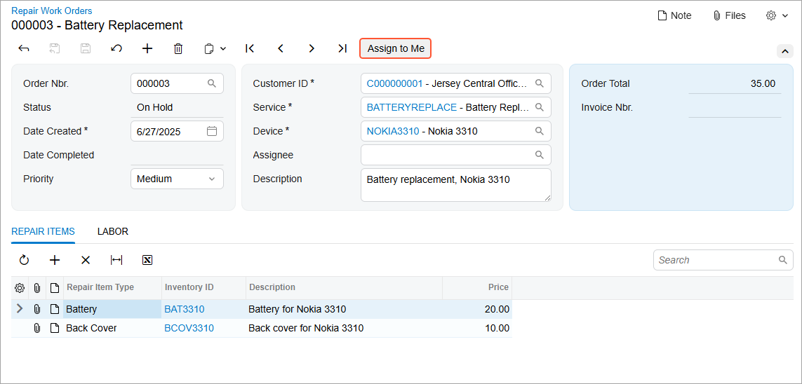 _(Events.RowSelected<RSSVWorkOrder> e)event handler, add the following code to the end of the method.AssignToMe.SetEnabled((row.Status == WorkOrderStatusConstants.ReadyForAssignment || row.Status == WorkOrderStatusConstants.OnHold) && WorkOrders.Cache.GetStatus(row) != PXEntryStatus.Inserted);In the code above, you have disabled the Assign to Me button and command until the repair work order is saved in the database by checking theWorkOrdersobject status in the PXCache. - In the