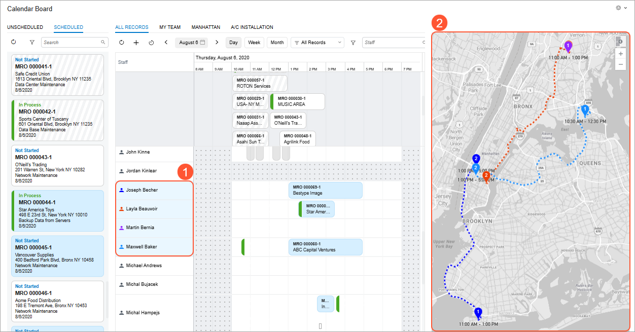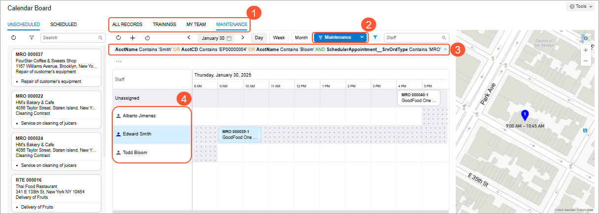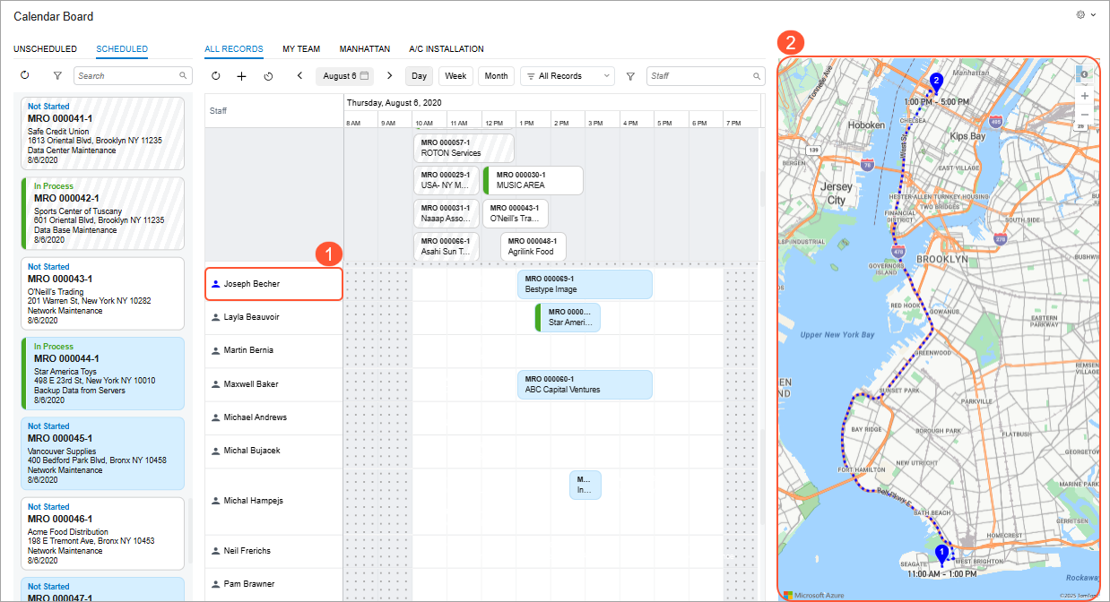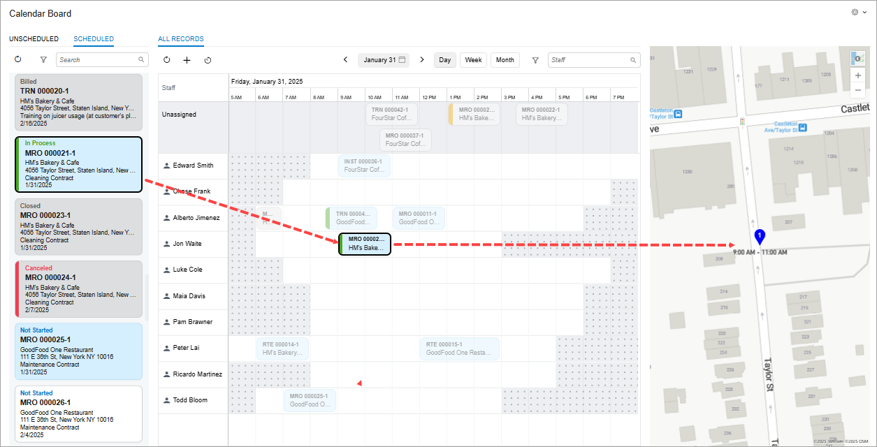 Map functionality is built into the new calendar on the Calendar Board (FS300300) form. This visual representation of appointments helps you easily track and manage staff locations, optimize routes, and enhance scheduling efficiency.