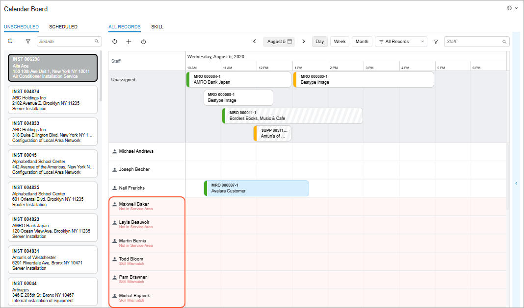 - Assign an appointment to any staff member but receive a warning when there's a skill, license, and service area mismatch.