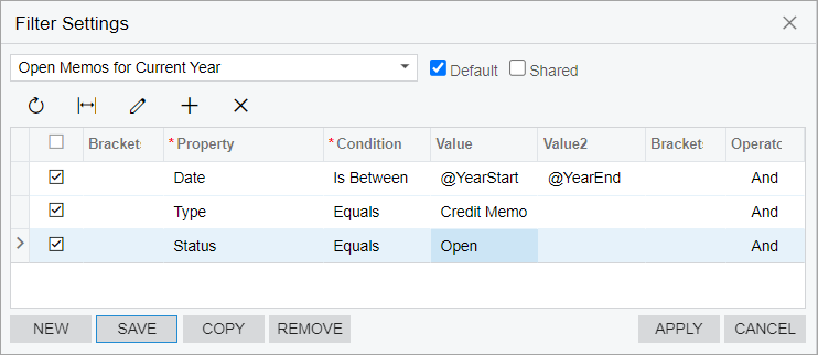 The settings of the Open Memos for Current Year filter are shown in the following screenshot.