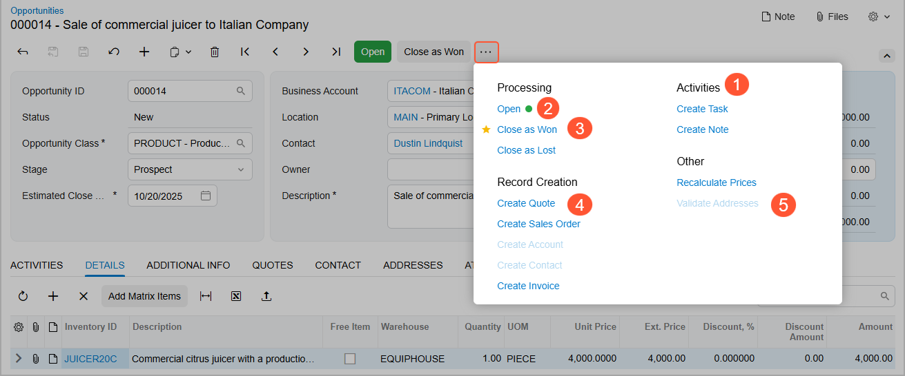 The form toolbar may also include form-specific buttons (for example, processing buttons) and commands. The form-specific commands can be shown as buttons on the form toolbar, as commands on the More menu, or in both places. Below you can see the basic elements of the form toolbar on the Opportunities (CR304000) form.