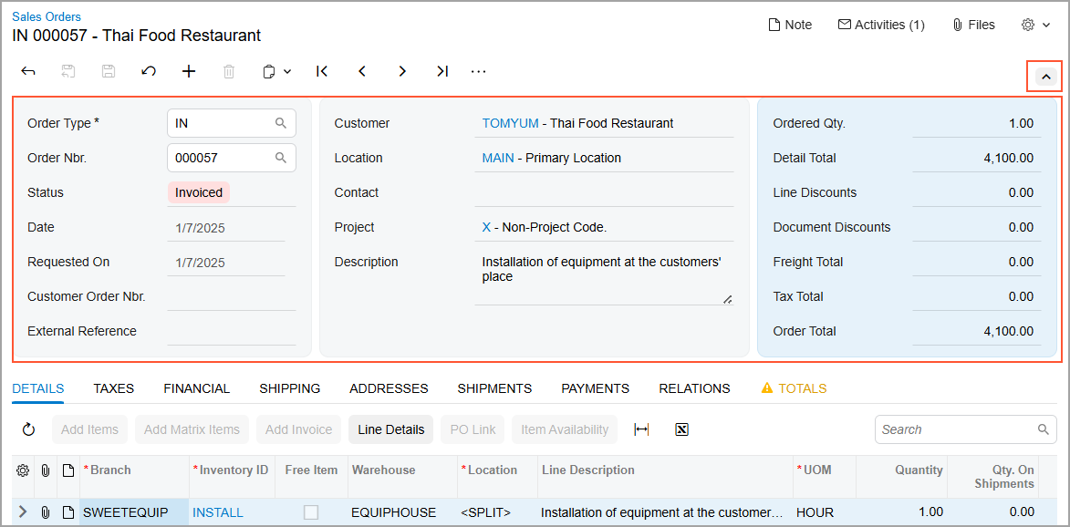 - The Details tab contains rows that correspond to each line of the sales order.