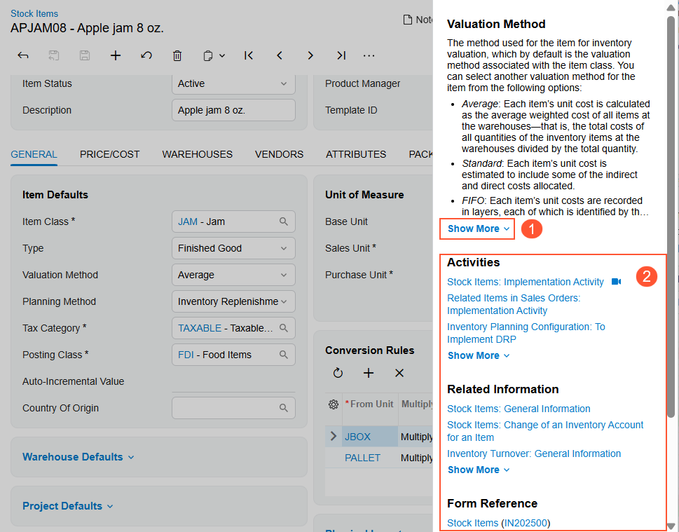 Once you click the question mark for an element, the system opens the infotip: a pane that partially overlaps the working area of the screen. In the beginning of the pane, the element's description is shown. If an element's description is long, the Show More link is displayed (Item 1 below). When you click Show More, the full text of the description is shown.