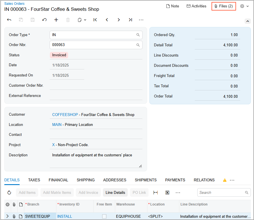 Below you can see the number of files attached to a bill selected on the Sales Orders (SO301000) form. If a file is attached to the record detail (for example, a line of a bill), the system doesn’t increment the counter on the form title bar.