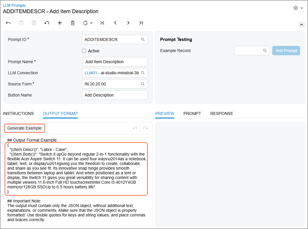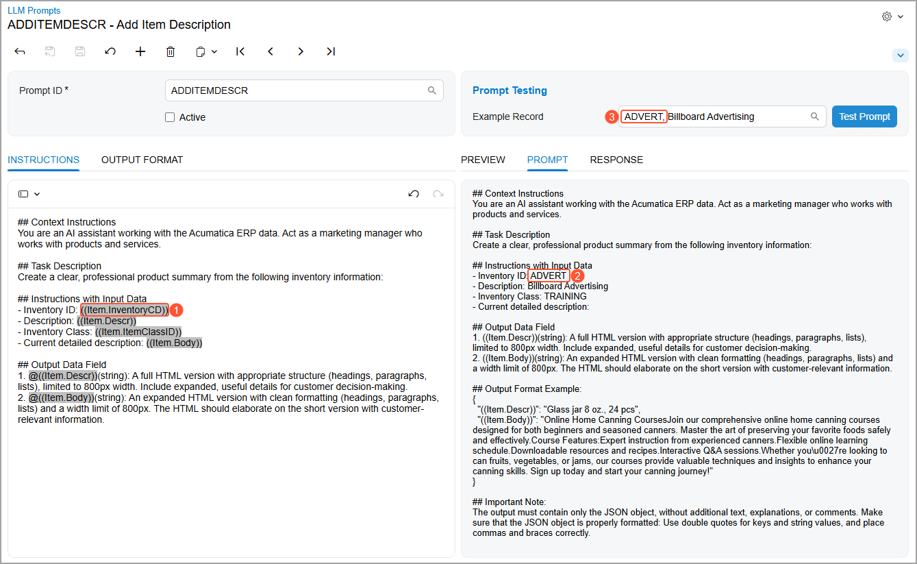 After you specify all the needed settings, you need to test the prompt definition on the data from your instance. You use the right pane of the LLM Prompts (ML202000) form for the testing as follows: