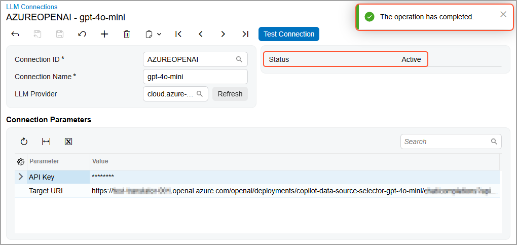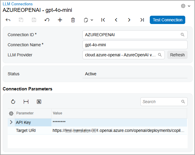To make sure the connection works, you click Test Connection on the form toolbar. The system sends a request to the LLM provider, which verifies the connection data.