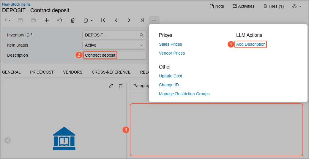 After you select the Active check box and save your changes on the LLM Prompts (ML202000) form, the system adds the new command (Item 1 below) to the More menu of the corresponding form—the Non-Stock Items (IN202000) form in this example. Before you click this command, the Description box (Item 2) and the Description tab (Item 3) may contain some text, or they can be empty.