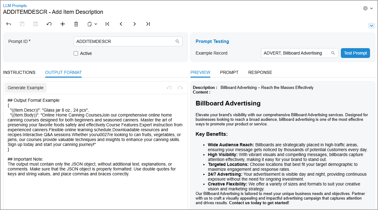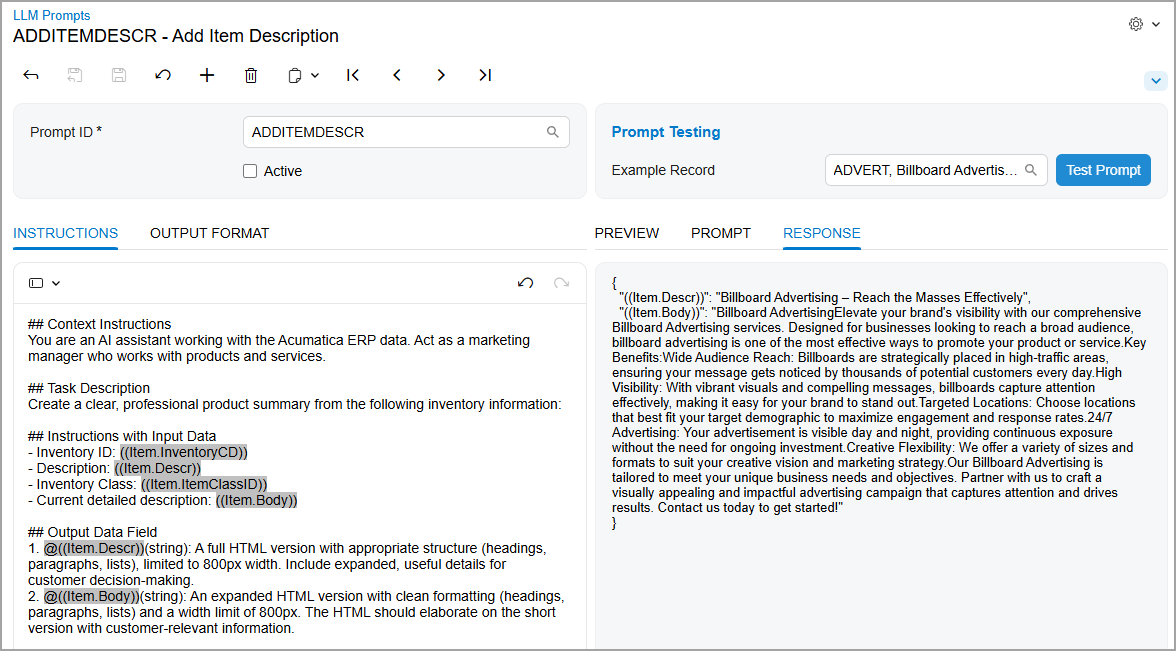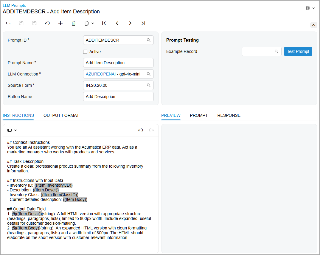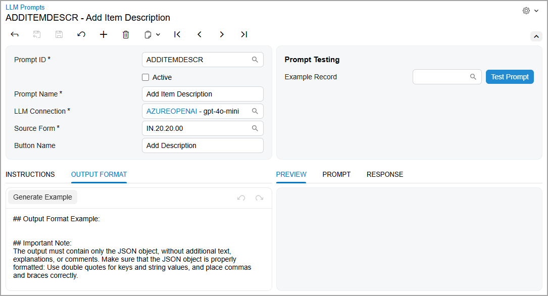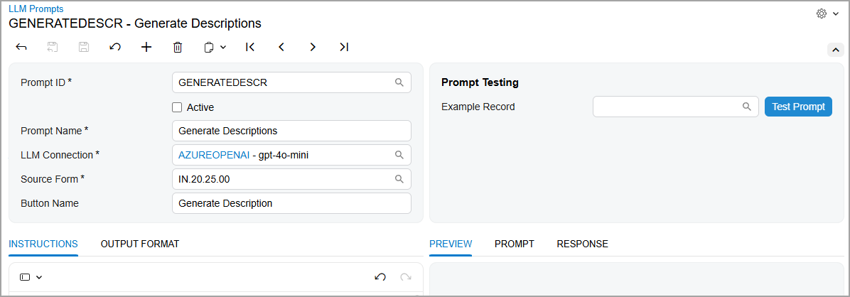 You create prompt definition on the LLM Prompts (ML202000) form, which is shown below. A prompt definition establishes the full structure of a prompt—including instructions, input data, and output formatting. The system uses this definition to generate actual prompts when users click a command or run a test.